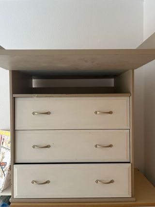 Bonito cambiador de bebé de color blanco, en buen estado. Ideal para organizar el aseo de tu bebé. - Medidas aproximadas: 75cm de largo. - Tres cajones para guardar pañales, cremas y otros artículos. - Superficie amplia para cambiar al bebé con comodidad. - Estructura sólida y estable.