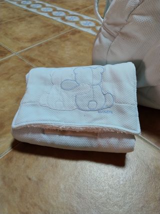 Precioso cambiador de bebé de la marca Mayoral, en color gris claro. Está en perfecto estado. - Diseño acolchado con forma de triángulos. - Cierre con botón. - Incluye un lazo decorativo.