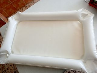 Cambiador bebé hinchable, ideal para cambiar pañales de forma cómoda y segura. Es blanco y se encuentra en buen estado. - Hinchable para fácil almacenamiento y transporte. - Superficie acolchada y suave. - Perfecto para viajes o uso en casa.