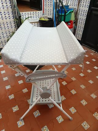 Vendo Cambiador para bebés con estructura plegable y bandeja inferior con las siguientes características: - Colchoneta acolchada con estampado de lunares. - Bandeja de plástico con orificios para drenaje. - Patas metálicas blancas. Sus medidas son 93 cm de alto, 48 cm de ancho y 78 cm de profundidad, se encuentra en muy buen estado y se puede usar perfectamente, se tendría que recoger en la localidad sevillana de Dos Hermanas