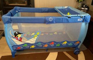 Cuna de viaje en color azul con un divertido diseño de piratas y peces. - Incluye un móvil con estrellas. - incluye colchon - trae gatera - elevador para cambiar al bebe - Laterales de malla para ventilación. - Ruedas para facilitar el transporte.
