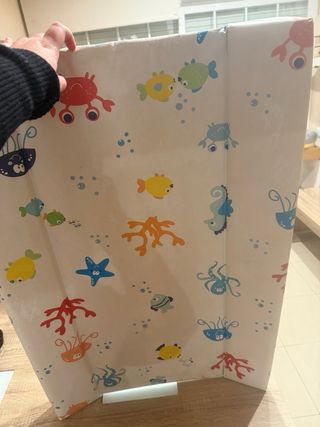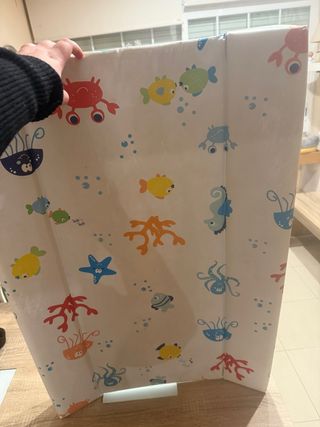 Cambiador de bebé con un divertido diseño de animales marinos y burbujas. - Estampado de peces, cangrejos, estrellas de mar y pulpos. - Tonos alegres y coloridos. - Superficie fácil de limpiar.