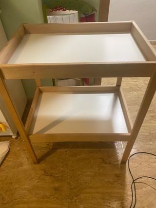 Mueble cambiador para bebé, ideal para organizar y cambiar pañales. 50€ nada negociable recogida en mi puerta no me desplazo Incluye colchoneta y funda de rizo. - Estructura de madera blanca. - Bandeja superior con bordes elevados. - Dos estantes inferiores. - Diseño sencillo y funcional.