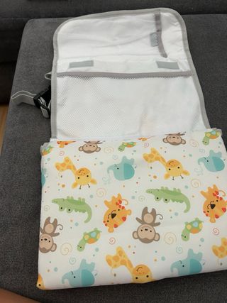 Cambiador portátil con un divertido estampado de animales. Se ha usado 3 veces como mucho. Tenemos otro que venía con el carro y no precisamos de más. - Diseño con jirafas, elefantes, cocodrilos y monos. - Cierre con hebilla. - Ribete gris.