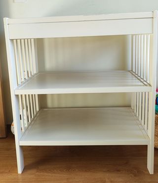 Cambiador de bebé en color blanco, con dos estantes inferiores para almacenamiento. - Estructura de madera. - Bandeja superior con protector. - Diseño de barrotes laterales. Es de Ikea,marca Gulliver. Esta perfecto,salgo pequeños desperfectos que se ven en la fotos.