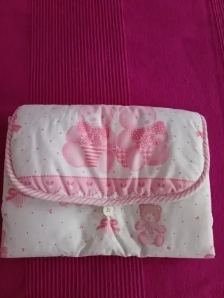 Práctico cambiador portátil para bebés, ideal para llevar de viaje. Presenta un adorable diseño con ositos rosas sobre fondo blanco. - Estampado de ositos y lazos. - Ribete rosa a juego. - Cierre con botón.