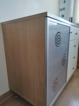 Cómoda con diseño moderno y funcional, ideal para la habitación infantil. - Puerta de plástico y diseño de espirales. La puerta no ajusta del todo bien. Falta madera del estante. - Cuatro cajones amplios. - Acabado en madera clara y blanco.