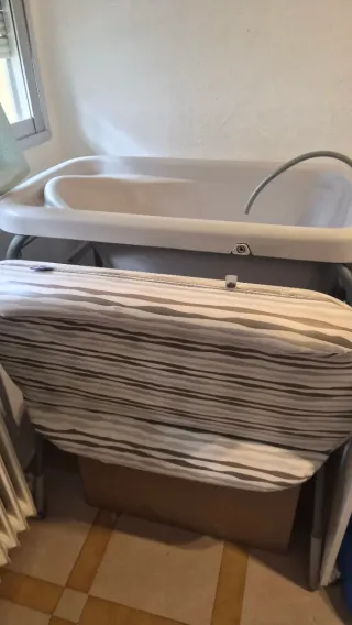 Cambiador con bañera integrada marca Chicco. Tiene ruedas, se puede adaptar en tres alturas, tiene de dos jarras para el agua, un soporte para guardar champú,toallitas ..., un soporte para colgar toalla, un desagüe integrado. Se puede plegar, tiene roto parte del cambiador pero con un protector no impide su uso.(Última foto) Regalo protectores + dos cajitas para toallitas