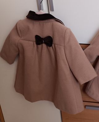 Precioso abrigo para niña, talla 6 meses. Dispongo de dos unidades. Están en perfecto estado, como nuevos. - Color beige con detalles en marrón oscuro. - Cuello y lazos de terciopelo. - Diseño clásico y elegante. - Ideal para eventos especiales o uso diario.
