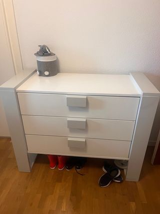 Cambiador para bebé de Ikea, modelo Smastad. Su diseño blanco con cajones en gris, que se adapta a cualquier habitación infantil. - Estructura de melamina. - Cajones sin tiradores de color gris. - Compartimentos abiertos para almacenamiento. - Muy bien cuidado. Tiene mucho espacio en la parte superior para poner un cambiador y varios cestos con los productos del bebé. Los cajones son de gran capacidad. Además, se convierte a futuro en escritorio. Solicitar más fotos si se quiere. Muy bien cuidado, sin roces ni marcas. Estado impecable. Se entrega montado y solo en persona.