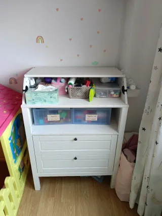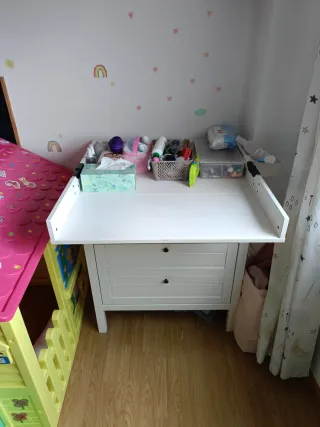 Cambiador SMÅSTAD de Ikea en color blanco abedul. Ideal para la habitación del bebé. Es evolutivo ya que bajando la zona de cambiador se hace escritorio - Diseño con 3 cajones. - Medidas: 90x79x100 cm. Se vende montado vivo en un quinto con ascensor No se ha usaso para nada solo de adorno... Tiene unas marcas de apoyar algo ultima foto qye casi no se aprecia n la foto pero por si acaso