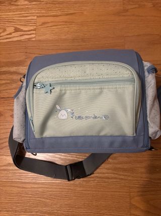 Práctica mochila cambiador para bebé con un adorable diseño. - Color azul y verde menta. - Estampado de topitos plateados. - Dibujo de conejito y little garden. - Cremallera frontal con tirador de estrella. - Correa ajustable para colgar.