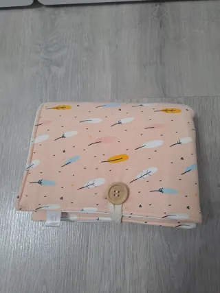 Práctico cambiador para bebé con un bonito estampado de plumas en tonos pastel. Ideal para llevar en el bolso o la mochila. - Diseño con plumas en rosa, blanco, azul y amarillo. - Cierre con botón de madera y cinta. - Tejido suave y fácil de limpiar.