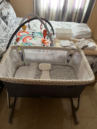 Cuna de colecho de la marca Jane, modelo Baby Side. Perfecta para tener al bebé cerca durante la noche. - Diseño moderno con estampado de estrellas grises. - Laterales de malla transpirable. - Incluye colchón y protector. - Estructura metálica con ruedas. Se regula para poder ponerla a la altura de la cama. Nos a ido muy bien, la vendemos porque hemos pasado a nuestro peque a su habitación. Viene con: 3 sabanas bajeras, 2 sabanas encimeras, 1 sabana para poner el nordico, 3 nordicos, 1 cojin anti vuelco, 1 cambiador y 1 manta de juegos.