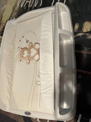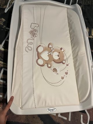 Estructura de cambiador portátil con colchoneta. - Diseño con estampado de osito y abejas. - Laterales elevados para mayor seguridad. - Compartimentos laterales para organizar artículos de bebé. - Marca: Brevi.