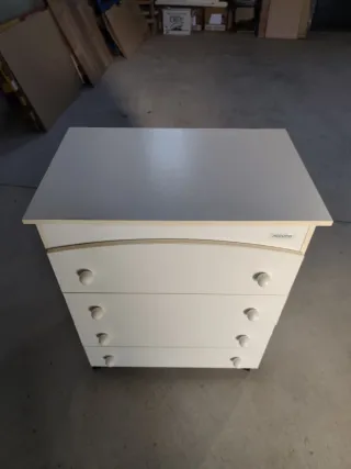 Preciosa cómoda cambiador para bebé, en color blanco. Perfecta para organizar la habitación del bebé con estilo y funcionalidad. Se transforma en escritorio.Original 182€ - Estructura robusta y estable. - Tres cajones amplios para guardar pañales, cremas y ropa. - Un estante abierto para tener a mano los artículos esenciales. - Superficie amplia y cómoda para cambiar al bebé.