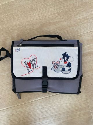 Cambiador portátil para bebés, ideal para llevar a cualquier parte. Está en buen estado y es muy práctico. - Diseño con Piolín y un ratón. - Incluye asa para transportarlo fácilmente. - Cierre con velcro para mantenerlo cerrado.