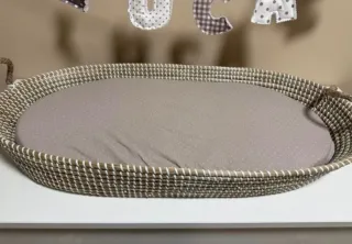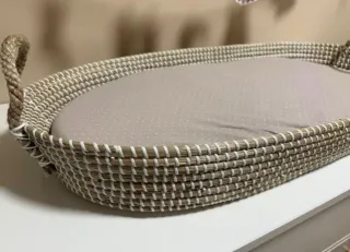 Cambiador para bebé con un diseño de cesta de mimbre. La funda interior es de color gris con pequeños puntos blancos. - Cesta de mimbre trenzado. - Funda interior suave con estampado de puntos.