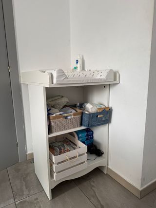 Mueble cambiador para bebé, en color blanco, ideal para organizar la habitación infantil. Está en muy buen estado. - Perfecto para cambiar pañales. - Con espacio de almacenaje. - Diseño moderno y funcional. - Incluye ruedas para facilitar su movimiento. Medidas: Altura: 90cm Ancho: 72cm Profundidad: 48cm