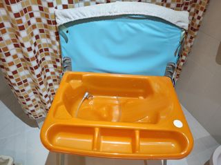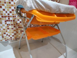 Bañera ergonómica con soporte plegable, con bandeja para depositar los enseres para cambiar al bebé, con tubo para desaguar... Todo en perfecto estado salvo de las esquinas del cambiador que están rajadas pero no impiden su correcto uso.