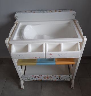 Práctico cambiador-bañera de la marca Cosatto, en perfecto estado. - Diseño infantil con estampado de círculos de colores. - Incluye varios compartimentos para organizar. - Ruedas para facilitar su movilidad. - Montaje fácil y sencillo. - Se entrega en su embalaje original.