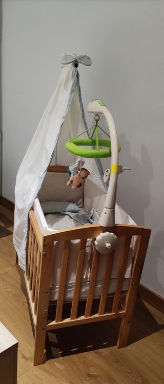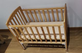 Vendo minicuna de madera. Está en muy buen estado y es perfecta para los primeros meses del bebé. - Estructura de madera. - Cambiador acolchado. - Tejido gris y beige. - Incluye colchón.