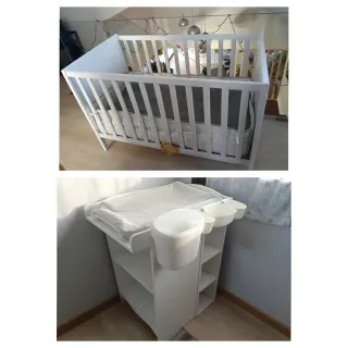 Se venden cuna y cambiador de Ikea juntos o por separado. - Cuna de madera blanca modelo Sundvik. - Cambiador con diseño a juego mas estantería modelo SmåGöra. La cuna incluye colchón Skönast, protector de cuna/chichonera Len, edredón Lenast y un juego de funda nórdica mas otro de regalo junto con 3 sábanas bajeras. El cambiador con accesorios 1 estantería, juego de cestos Önsklig, cambiador hinchable blanco Skötsam y 2 fundas para cambiador (a juego con las 2 fundas nórdicas). En buen estado con alguna marca de uso, valor de todo el conjunto 423 € se vende en 250 € no se aceptan envíos y podría acercarlo a domicilio.