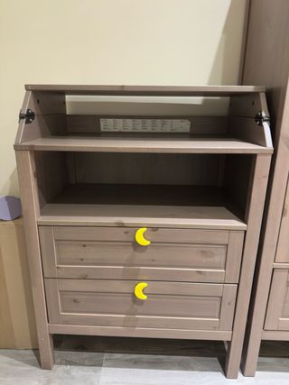 Cambiador de bebé de la serie Sundvik de Ikea en color marrón. Un mueble práctico y elegante para la habitación infantil. - Diseño de madera en tono marrón. - Incluye dos cajones con tiradores. Conservamos los tiradores originales. Disponemos del armario y la cuna a conjunto.