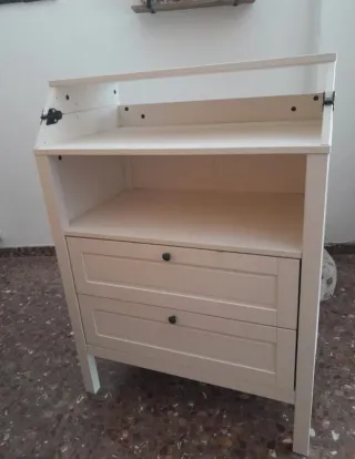 Mueble cambiador Ikea Sundvik - Dos cajones amplios para almacenamiento. - Estante superior desplegable para fácil acceso al cambiador. - Estructura robusta y estable. Tiene los detalles expuestos en la foto, lo vendo sin desarmar.