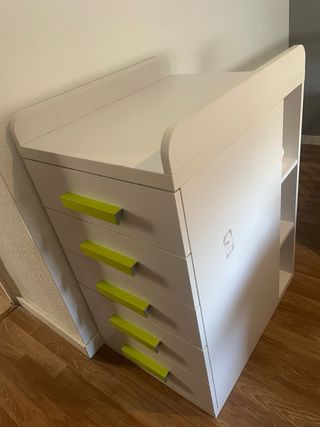 Mueble cambiador con cajones y espacio de almacenaje. - Diseño moderno en color blanco. - Tiradores de cajón en color verde lima. - Estructura con estantes abiertos. Pesa bastante para cargarlo solo una persona.