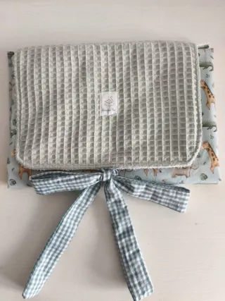✨ Cambiador de viaje: Dulzura y practicidad en uno ✨ Este cambiador de viaje está hecho a mano con muchísimo mimo, cuidando cada detalle para los más peques de la casa 🍼 En Estudio Toti os traemos este diseño tan especial: por un lado, una tela de gofre ultra suave en un tono verde agua que te enamora; por el otro, un estampado de animalitos súper divertido 🦒🐘. Se pliega fácilmente y se cierra con un precioso lazo de tela vichy. Ideal para regalar a unos futuros papis o para darnos un capricho y llevar las cosas de nuestro bebé con todo el estilo ✨👶 Personalízalo como más te guste. Siguenos en Instagram @estudiototi