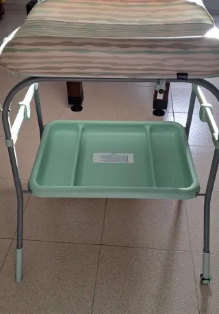 Práctico cambiador con bañera incorporada para el cuidado del bebé. Incluye varios compartimentos para tener todo a mano. - Estructura metálica. - Bañera blanca. - Bandeja inferior azul. - Ruedas para fácil movilidad. Incorpora dos fundas de rizo tipo toalla para cambiador en color blanco con gomas ajustables porque el plastico que cubre la base esta muy desgastado. Entrega solo en mano