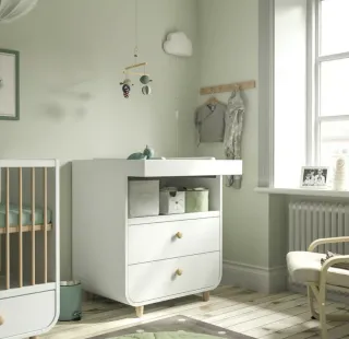 Mueble cambiador de bebé en color blanco. Cuenta con dos cajones para almacenamiento.