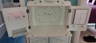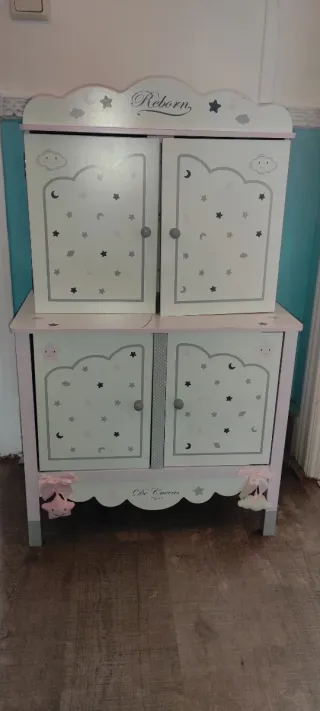 Mueble cambiador para muñecas Reborn. - Diseño con nubes y estrellas. - Dos puertas en la parte superior y dos en la inferior. - Adornos de lazo rosa. Tiene muchos signos de uso, está tal cual en las fotos, sin accesorios, como se puede ver, se reforzó toda la parte de adentro con silicona y tiene una escuadra en una de las patas. Se entrega como está montado, y no se envía. Lo vendo porque a mí hija ya le queda muy bajo para jugar, pero está firme y aún se puede seguir usando.