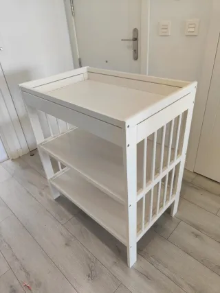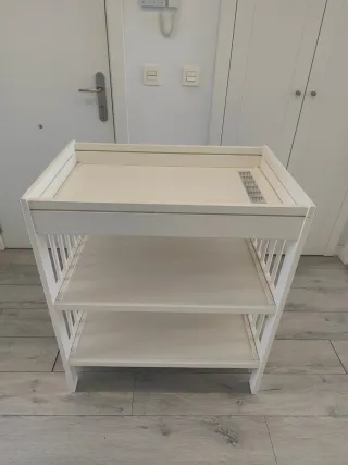 Se vende conjunto de cuna y mueble cambiador de IKEA. Ideal para la habitación del bebé. - Cuna blanca (colchon y chichonera a parte) - Mueble cambiador con cajones. Regalo cambiador con funda