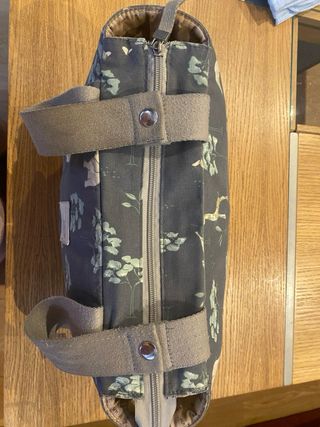 Preciosa bolsa para bebé en color beige claro, con estampado floral discreto. Incluye un neceser a juego y un cambiador. La bolsa es espaciosa y cómoda de llevar. - Bolsa de tela resistente. - Diseño elegante y práctico. - Incluye neceser y cambiador a juego. - Perfecto estado.