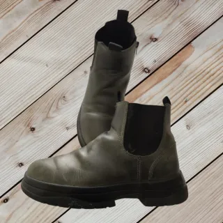 Botines estilo Chelsea de Zara en talla 33. Un calzado versátil y cómodo. - Color verde oliva. - Cierre lateral elástico. - Suela gruesa negra.