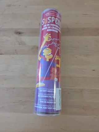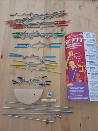 Juego de mesa Suspend de Melissa & Doug. El objetivo es colgar piezas sin que se caiga la estructura. - Incluye instrucciones en varios idiomas. - Diseño colorido y divertido.