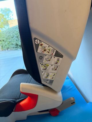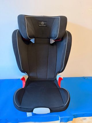 Silla de coche para niños de la marca Mercedes-Benz. Diseñada para ofrecer seguridad y comodidad. - Tapicería en color negro. - Detalles en gris y rojo. - Reposacabezas ajustable.