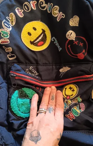 Mochila azul marino con divertidos parches de caritas sonrientes y un mundo. - Diseño acolchado. - Bolsillo frontal con cremallera. - Detalles de pelo en los laterales. - Cierre principal con cremallera.