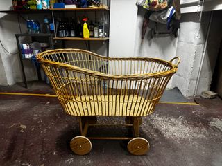Cuna de mimbre con un diseño clásico y práctico. Perfecta para el descanso del bebé. - Estructura de mimbre. - Base de madera. - Ruedas de madera para facilitar el movimiento.
