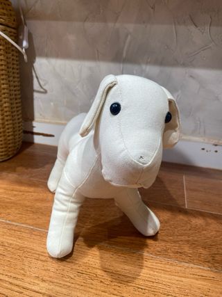 Figura decorativa de un perro hecha de tela. - Color blanco. - Diseño de perro. - Material de tela. -Le falta el hocico -Medida aprox: 33 largo x 29 alto