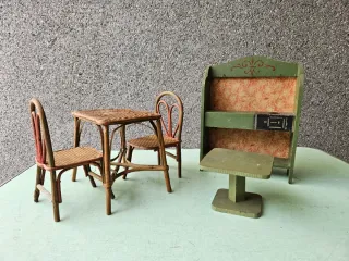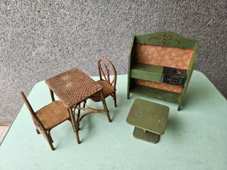 Conjunto de muebles de juguete de estilo vintage, años 30's del siglo pasado, perfectos para coleccionistas o decoración. - Mesa de mimbre con dos sillas, a una le falta una pata. - Cocinita verde con detalles decorativos y mesita auxiliar. Escucho ofertas.