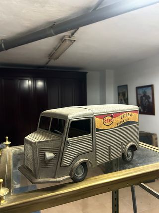 Camión de juguete de lata inspirado en el icónico Citroën HY, fabricado en 1959. Presenta un diseño detallado con carrocería acanalada típica del modelo real y decoración lateral de Esso Extra Motor Oil. Funciona con pilas, un detalle poco común para juguetes metálicos de la época. Muestra signos de uso y pátina propia del tiempo, lo que realza su autenticidad y valor como pieza de colección.