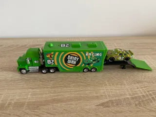 Set de camión y coche de juguete de la película Cars. - Camión de transporte de color verde. - Coche de carreras de color verde con detalles. - Ambos artículos son de metal.