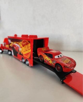 Se venden dos camiones de transporte con sus respectivos coches de la película Cars. Son de metal - Incluye dos camiones grandes y dos coches. - Los camiones tienen rampas desplegables. - Los coches son de metal y presentan detalles cuidados.
