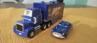 Se vende coche y camión de la colección de la película de "CARS", de Disney Pixar: "Cal Weathers 42", conocido como 'The blue falcon' de la escudería "Dinoco" y camión Mack Hauler. Modelos hechos en aleación de metal fundido a presión. Escala 1:55. Medidas: Cal Weathers; longitud 8,00 cms y anchura 3,50 cms y Mack; 22,5 x 5 cms. Sin ningún rayón, totalmente nuevos. Posibilidad de hacer envíos a través de Wallapop