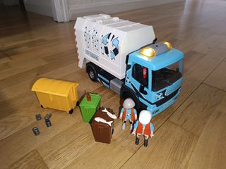 Se vende camión de basura Playmobil City Service. Está en buen estado y listo para jugar. - Incluye camión de basura, 2 contenedores pequeños, 1 contenedor grande amarillo y 2 figuras Playmobil. - El camión tiene luces. - Ideal para niños a partir de 4 años.