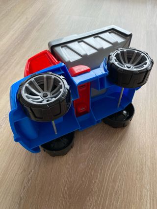Camión de juguete con temática de Spiderman, ideal para los fans del superhéroe. - Diseño en rojo y azul. - Incluye figuras de Spiderman. - Puertas y rampas abatibles.