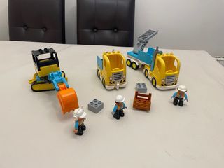 Set de construcción Duplo con excavadora y camiones. - Excavadora amarilla y azul con brazo articulado. - Camión volquete azul y amarillo. - Camión con remolque azul. - Incluye figuras de trabajadores y accesorios.